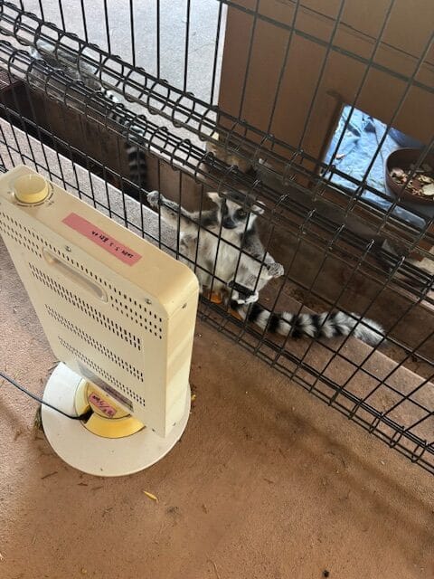 そして、ふれあいゾーンではストーブを占領するワオキツネザルや・・・
