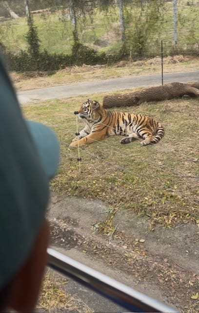 サファリゾーンでバスからトラを見て、食べられないように後ずさりする次男・・・