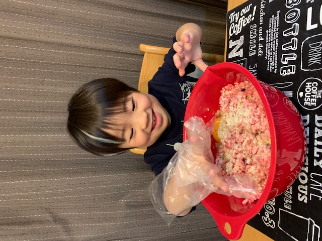 先日の餃子包みが楽しかったようで、「次はハンバーグ作ろうな!」と