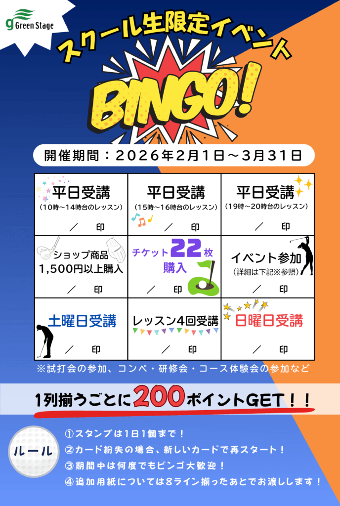 2月1日から3月31日までの2か月間、スクール生限定イベントBINGOを開催しております。